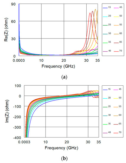 FEM simulations of the (a) real and (b) imaginary parts of the impedance from 0.3 MHz to 35 GHz for the IDC sensor loaded with lossless MUTs having a real part of the relative permittivity varied from 15 to 70 with a step of 5.
