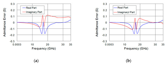 Difference between FEM and equivalent-circuit simulations of the real (blue lines) and imaginary parts (red lines) of the admittance from 0.3 MHz to 35 GHz for the IDC sensor loaded with a lossless MUT having a real part of the relative permittivity of 70: (a) equivalent-circuit simulations based on the local model and (b) equivalent-circuit simulations based on the modified broadband model.