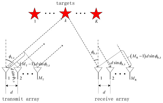where K is the number of targets in a range-bin of interests, and are DOD and DOA, respectively, , d is the spacing of two adjacent antennas, and is the wavelength.