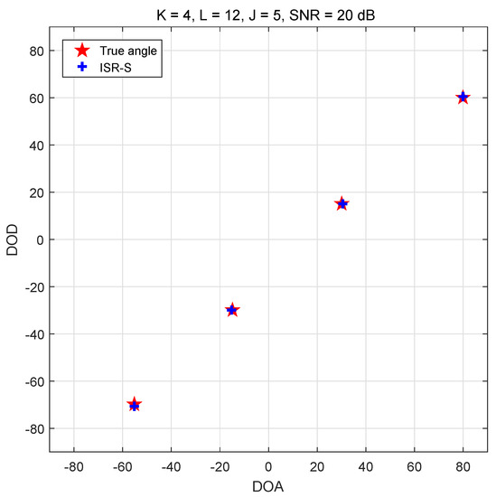 In the first example, we assess the target localization performance of the proposed ISR-S method with unknown target numbers. The DODs and DOAs are , , , and . The rest system parameters are , , , and . As shown in Figure 2, we can clearly see that our proposed algorithm can localize all targets accurately and estimate DODs and DOAs effectively. In addition, its performance is well even with low sampling numbers, i.e., .