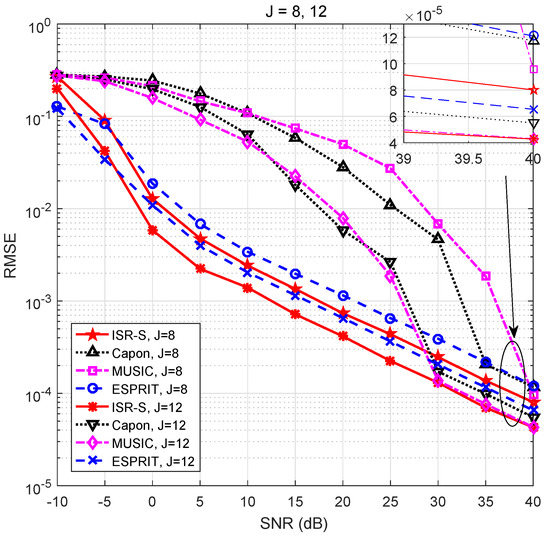In the second example, we compare the proposed ISR-S method with existing Capon, MUSIC, and ESPRIT methods through Monte Carlo simulations with given target numbers, where and . Figure 3 and Figure 4 show the impact of different sampling numbers L and antenna numbers J on the RMSE performance for the above methods, respectively. To ensure that Capon, MUSIC, and ESPRIT algorithms work, orthogonal transmitted waveforms are considered in this example. In addition, the angular resolution of Capon and MUSIC algorithms is set as for a fair comparison. However, such a small step size greatly increases the complexity. In order to save time to some degree, we look for all peaks in two stages. At the first stage, a scanning step size of is chosen to find K peaks. At the second stage, we refine the angle estimation around these K peaks with a step size of . It can be seen in Figure 3 and Figure 4 that the RMSE of all methods decreases as L and J increase, and the proposed super-resolution method is superior to existing methods when the SNR is above a certain threshold. The Capon and MUSIC methods cannot accurately localize all targets at each Monte Carlo run and thus results in a poor angle estimation performance at a low SNR. Their performance is also greatly sensitive to sampling numbers, represented by L, and antenna numbers, represented by J. Though the ESPRIT method has better performance than the Capon and MUSIC methods, there is still a large gap between the ESPRIT method and the proposed ISR-S method. At an RMSE of , the gap between the ESPRIT method and the proposed ISR-S method is about 3.3 dB for and 3.9 dB for .