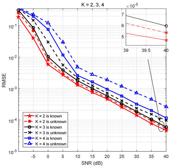 In the third example, we study the influence of the proposed ISR-S method for different target numbers through Monte Carlo simulations, where , , and . In particular, we consider the case that the number of targets is unknown. The proposed ISR-S method is carried out following Algorithm 1 with and for , respectively. The existing Capon, MUSIC, and ESPRIT methods cannot work in this case. It can be seen in Figure 5 that the RMSE performance of the proposed ISR-S method is improved as K decreases in both cases of known and unknown target numbers. We can also observe in Figure 5 that the proposed method still has high estimation accuracy above an SNR threshold even with unknown target numbers and low sampling numbers, i.e., .