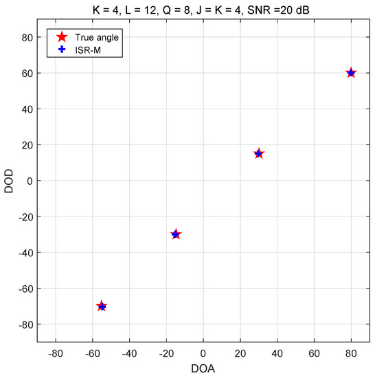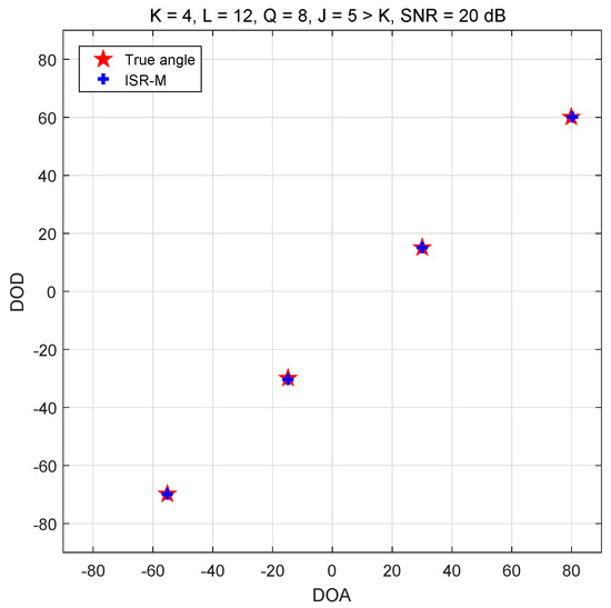 In the first example, we assess the target localization performance of the proposed ISR-M method with unknown target numbers, in which and . In particular, we compare the case of and . The rest of the system parameters are the same as the first example in the previous subsection. As shown in Figure 6 and Figure 7, we can clearly see that our proposed ISR-M algorithm can estimate DODs and DOAs effectively, and accurate localization is also achieved when , even with unknown target numbers and low sampling numbers.