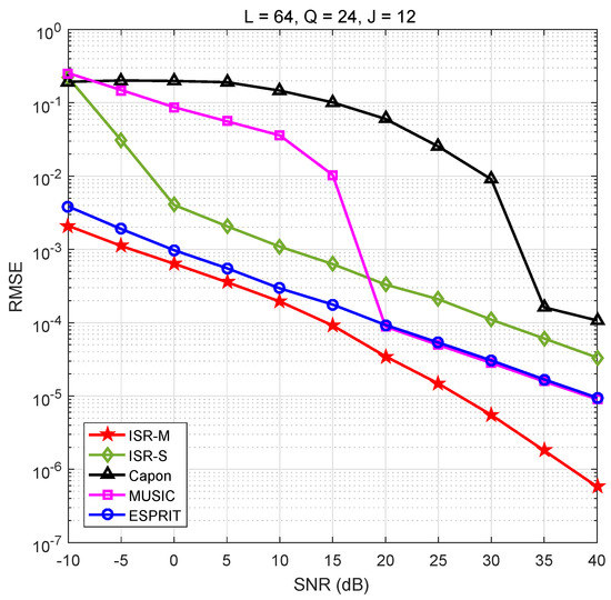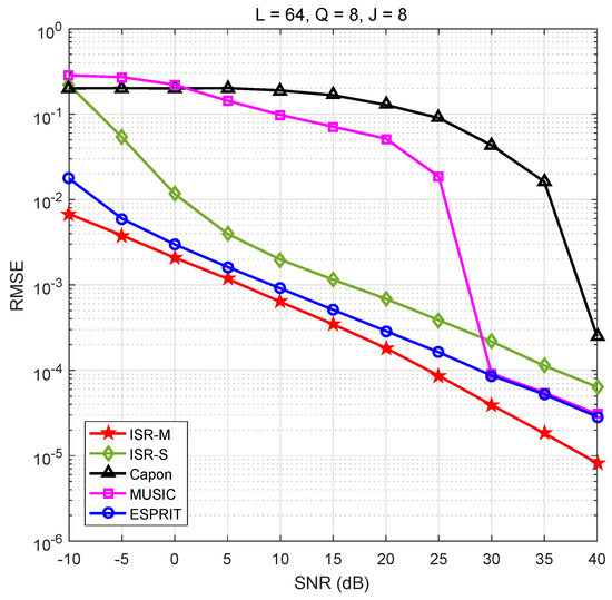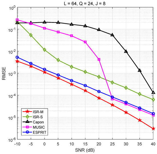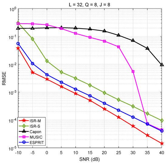 In the second example, we compare the RMSE performance of the proposed ISR-M method with that of existing Capon, MUSIC, and ESPRIT methods for different L, Q, and J values through Monte Carlo simulations with given target numbers, where and . In particular, the RMSE curves of the proposed ISR-S algorithm are also plotted in this example. An angular resolution identical to that in the second example of the previous subsection is chosen for Capon and MUSIC algorithms. For the ISR-S method (or the first stage of the ISR-M method), the main computational cost in each iteration rests with computing the gradient in Step 3 (or Step 1.3.1). The computational complexity for computing the gradient in each iteration is . For the second stage of the ISR-M method, the computational complexity in each iteration for Step 2.3, 2.4, and 2.5 are , , and , respectively. Therefore, the overall computational cost is for the ISR-M method. For Capon and MUSIC methods, a small scanning step size is usually chosen to improve the angular resolution in practice, which means that the required iteration number is greatly increased in order to achieve a localization accuracy identical to that of other algorithms. Therefore, their complexity is usually higher than the proposed ISR-S and ISR-M methods. Since the ESPRIT method does not involve iterations, its complexity is the lowest among these methods. Comparing Figure 8, Figure 9, Figure 10 and Figure 11, we can clearly see that the estimation performance of all methods except ISR-S is improved as L, Q, and J increase. Note that, because only one pulse-period-received information is used, the performance of the proposed ISR-S algorithm is not sensitive to Q and only affected by L and J. However, the proposed ISR-S method still shows better localization performance than the Capon and MUSIC algorithms at a low SNR. It can also be seen that the proposed ISR-M method invariably outperforms existing methods regardless of L, Q, and J. Even in the case of a high SNR, in which the MUSIC algorithm shows better performance than the ESPRIT algorithm, there is always a gap of at least 6.5 dB between the ISR-M method and the MUSIC method.