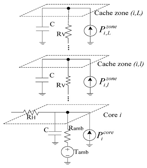 where and represent the temperature of cache_zone(i,l) and core i, is the thermal resistance between the core and the ambient environment, is the thermal resistance between different cache zones in adjacent layers, is the ambient temperature, and and are the power consumptions of cache_zone(i,l) and core i, respectively. In Equation (2), becomes Pgated, which is a very small quantity of leakage power consumption, when cache_zone(i,l) is inactivated.