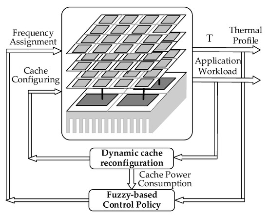 We tried to solve the issue through a combined fuzzy-based thermal management scheme that did not depend on a precise system model and that simultaneously considered the power consumption of cores and stacked caches. The proposed thermal management scheme is shown in Figure 3. On-chip caches play an essential role in improving system performance, which consumes a large portion of system power. The dynamic cache reconfiguration scheme determines the size of the cache for the processing core according to the application that reaches a substantial amount of power consumption savings. Each core has a fuzzy logic controller that manages one super-core. Based on fuzzy logic rules, the fuzzy-based control policy adjusts the frequency level of the cores, a process that can further improve system performance.
