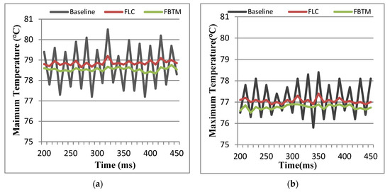 The transient maximum temperature curves while executing mem2 and com2 program sets are shown in Figure 6. The results show that the transient maximum temperature curves of the FLC and the FBTM were steadier than the baseline. From Figure 6, we can observe that the temperature of the baseline fluctuated faster near the threshold temperature, and its fluctuation could be as large as 3.5 degrees. By contrast, the FLC and the FBTM could stably control to the volatility within 0.5 degrees, achieving about 3 degrees of temperature reduction. This was due to the baseline considering too little information and ignoring feedback between the leakage power consumption and temperature. The baseline only worked when the measured temperature was higher than the thermal threshold.