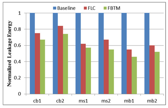 Leakage energy is the main component of the energy that can be saved by dynamically reconfiguring the cache size. Similarly, a reduction in temperature can also reduce the leakage energy of a system. The leakage energy reduction for the FLC and the FBTM normalized to the baseline is shown in Figure 7. On average, it was found that the FLC saved 33% in leakage energy, whereas the FBTM saved 41% for different test program suits. Shutting down the unused cache banks not only saves energy but also helps to control the temperature.