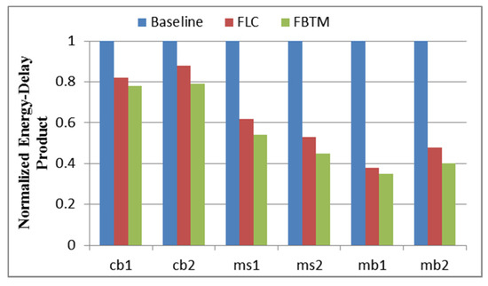 The results of energy efficiency normalized to the baseline for every program set are shown in Figure 8. Energy efficiency for thermal management schemes is called the energy-delay product (EDP). As shown in Figure 8, the FLC reached up to a 61% EDP reduction in comparison with the baseline, because the FLC regulated the frequency level of the processor core in real-time and finished the execution earlier than the baseline. Similarly, the FBTM reached up to a 65% EDP reduction compared with the baseline. The FBTM reached up to a 20% EDP reduction in comparison with the FLC because of the lower leakage power consumption. Compared with the baseline, the FLC and the FBTM reduced EDP by an average of 39% and 45%, respectively.
