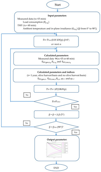 Photovoltaic generation profiles have been estimated considering different combinations of array tilt angle, from 0° to 90° at 5° increments, and orientation angles from −90° to 90°, where α = 0° corresponds to south. Array powers (P0) range between 0.01 kWp to 1000 kWp at 10 kWp step. Each one of these 21109 photovoltaic generation profiles, together with the olive mill load profile have been used to calculate the self-consumption and self-sufficiency indices on an annual basis, on an olive harvest basis and on a no olive harvest basis. This work considers olive harvest period from December to March; therefore, from April to November may be considered to be no harvest period.