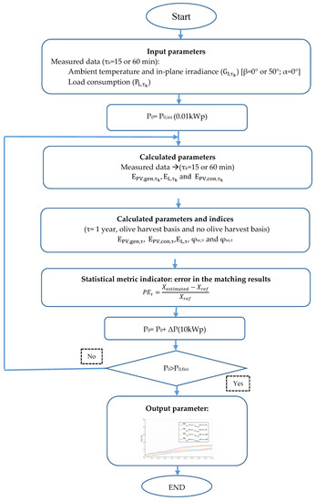 A photovoltaic self-consumption system can be evaluated by self-consumption and self-sufficiency indices, Φsc and Φss, respectively, together with energy parameters, such as the photovoltaic generated energy which is directly consumed, EPV,con [28]. The latter is estimated from olive mill load consumption data, EL, and photovoltaic generated energy data, EPV,gen, using Equation (6) [51,52]. EPV,con,k,τk corresponds to EL,k,τk when EL,k,τk is lower than EPV,gen,k,τk. Meanwhile, EPV,con,k,τk coincides with EPV,gen,k,τk when EL,k,τki is higher than EPV,gen,k,τk.