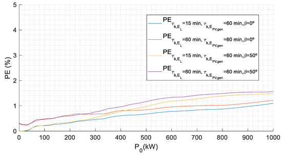 To provide a proper analysis, it is necessary to accurately know the irradiance and the load consumption profiles [70,71,72,73]. In this sense, the annual percentage error for EPV,con is estimated when a recording interval of 60 min of EPV,gen and EL is used instead of 15 min on an annual basis, as shown in Figure 3. As can be seen in this figure, annual PEs provide values lower than 1.6% when a recording interval of 60 min is considered. These small values of PE may be due to the shape of olive mills load profile: it is almost constant with a low variability during the daylight hours and the load profile is generally above the generation curves when P0 has a value lower than 200 kWp, as can be seen in Figure 4. This figure represents a harvest day with two different array powers, P0 (200 kWp and 500kWp) and different recording intervals (15 min and 60 min).