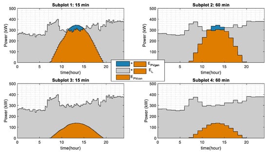 Daily photovoltaic generation and load consumption of an olive mill in Jaén (South of Spain). Load and Irradiance data correspond to 27 March 2019. EPV,con is represented by the orange area, EPV,gen is given by blue and orange area and EL is represented by grey and orange areas. In Subplots 1 and 2 the array power considered, P0, is 500 kWp, meanwhile Subplots 3 and 4 corresponds to array power of 200kWp. The recording interval is 15 min in Subplots 1 and 3; on the other hand, Subplots 2 and 4 has a 60 min recording interval. Orientation angle and tilt angle have a value of 0°.