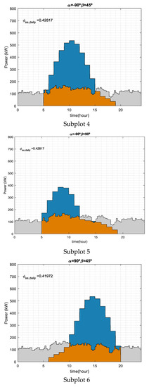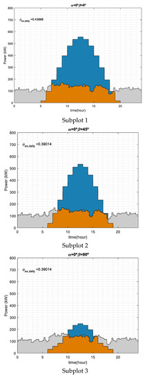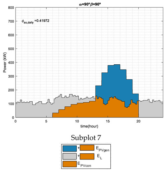 Figure 5 shows a no harvest day for three different orientation angles, 0°, −90°, and 90°, and three array tilt angles, 0°, 45°, and 90°. As can be seen, the different photovoltaic generator profiles may vary the self-sufficiency index from 0.39 to 0.44. For α = 0° the photovoltaic self-consumption energy is maximized at noon, Subplots 1, 2, and 3. However, in Subplots 4 and 5 for α = −90° the self-consumption energy is emphasized in the morning. Meanwhile, in Subplots 6 and 7 for α = 90° the photovoltaic generation is higher in the afternoon. Although the self-sufficiency indices are quite similar for the seven analyzed cases, the poorest result is obtained when south-facing and β = 45° and 90° are considered. It must be noted that 45° is the array tilt and the south-facing of orientation angles may be considered the optimum ones when the annual photovoltaic energy generation must be maximized [15,16,17]. This fact emphasizes the need for photovoltaic self-consumption analysis for a given load profile to find not only the optimum array energy generation but the tilt and orientation angles which maximize the matching capability.