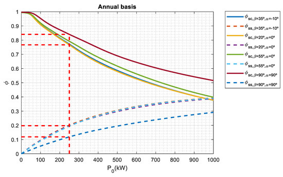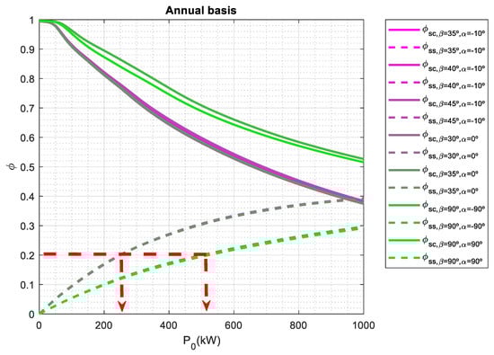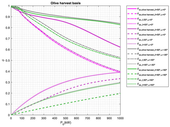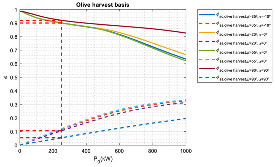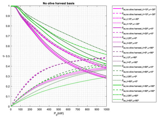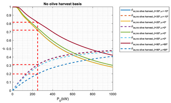 If a no olive harvest basis is considered, the array tilt angles that provide the best Φss may range from 0° to 20° and the orientation angles may vary from −30° to 0° and 90°. The array tilt angles are lower than the ones obtained on an annual basis and an olive harvest basis. It must be noted that this period corresponds to months where the sun is relatively high in the sky so the tilt angle must be low to maximize the collected energy. However, when P0 is larger than 600 kWp, the orientation angle needs to maximize self-sufficiency index, thus having a value of 90°. On the other hand, Φss has a minimum value when array tilt angle is 90° for most cases. Vertical façade is used in building-integrated photovoltaics (BIPV); however not only a significant impact on the annual energy output of BIPV system may be found due tilt and orientation angles [77], but also self-sufficiency index may be 25% lower as shown in Figure 5.