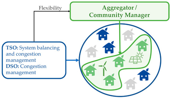 Regarding the role of the Aggregator in a local community, it depends on the market model. Still, this entity can operate in different parts of the network and use the associated resources for trading electricity and ancillary service markets. The Aggregator can also act as an intermediary for the transactions between small entities, such as consumers, and the wholesale market so it is the entity that accumulates flexibility through renewable-based generation and consumers (through DR), as Figure 1 presents. In the present paper, the Aggregator acts as a Local Energy Community (LEC) manager. In [7], LEC is defined as “an association, a cooperative, a partnership, a non-profit organization or other legal entity which is effectively controlled by local shareholders or members, generally, value- rather than profit-driven, involved in distributed generation and performing activities of a distribution system operator, supplier or aggregator at local level, including across borders”. Many benefits were previewed from this concept, namely regarding the relationship between the DSO and the communities: DSO is now allowed to manage some of the difficulties associated with the local generation (e.g., by controlling local flexibility resources) which could drastically reduce the network costs.