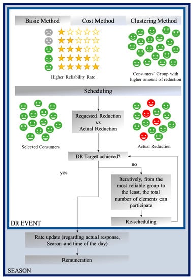 According to the actual response for DR events, in different temporal ranges, a reliability rate is assigned to each consumer. This rate was calculated through three independent rates. The way of using the reliability rate through the proposed methodology depends on three methods: Basic Rate Method, Cost Rate Method, and Clustering Rate Method.