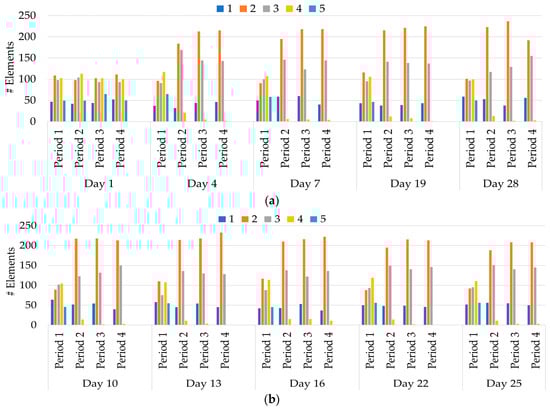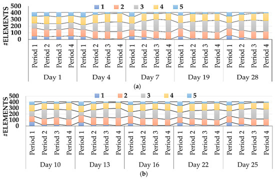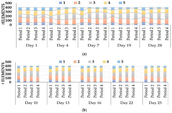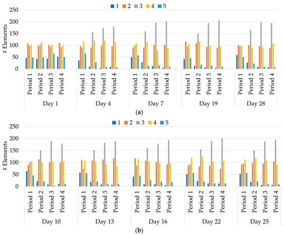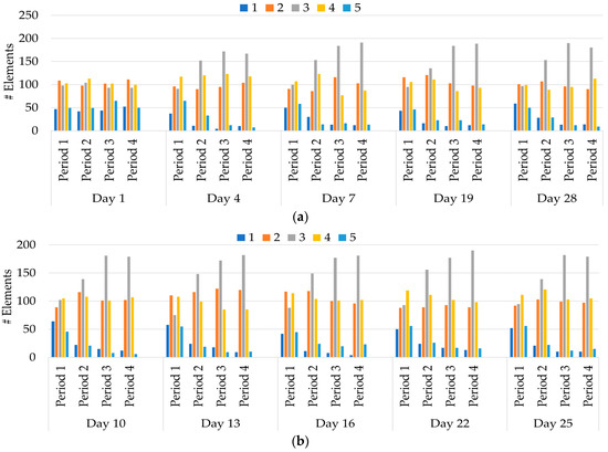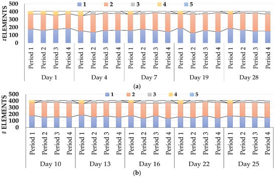Applying the same analysis to the results from Figure 5b, similar conclusions can retreat: Reliability Rate 3 was the one where the frequency of negative percentages (lower number of elements than initial) was higher, followed by Reliability Rate 4. The Reliability Rate 1 and Reliability Rate 2 had increased their number of elements most of the time. The Reliability Rate 5 also had the highest increase—366.67%, on Day 10, Period 4 – started with six elements and finished with 28.