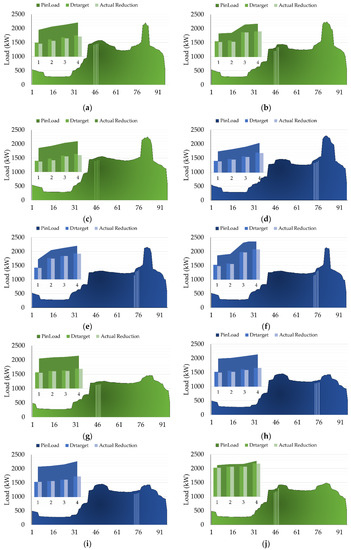 In this subsection, the results from the scheduling of the local community according to the method are presented. This method considers that all consumers with reliability rates above the nominated minimum are convoked. Still, the proposed optimization will decide which of those are selected to achieve the DR target for the events. Figure 4 shows the initial load curve for the event days (darker colour) and the values of the DR target (medium colour) and actual reduction (lighter colour) from each period. A more comprehensive chart of the DR event is also presented. Moreover, different colours were applied to ease the distinction between the type of events: One is green, and two is blue.