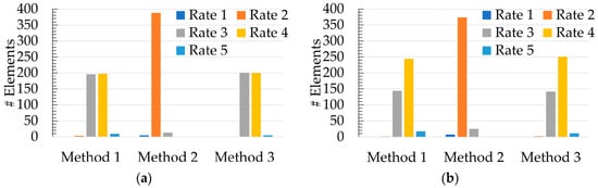 Figure 10 presents the total elements per Reliability Rate. The three methods were compared, and the groups with null values were hidden. Considering that the Basic Rate Method is Method 1, Cost Rate Method is Method 2, and the Clustering Rate Method is Method 3. Starting with Method 1, Figure 10a finds the more significant number of elements between Reliability Rate 3 and Reliability Rate 4 with a total of 394 elements. The other 12 elements were attributed to Reliability Rate 2 and Reliability Rate 5.
