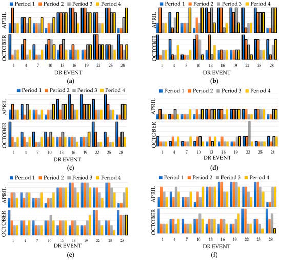 On Day 10, the DR event occurred between 6 pm and 7 pm. For the first event of this genre, the HR was the only rate considered in this Initial Rate. For Period 1, there were 253 elements capable of participating in the scheduling; in Period 2, 15 elements were added; Period 3 increased to 22 elements and, finally, for Period 4 the number of elements reached 292.