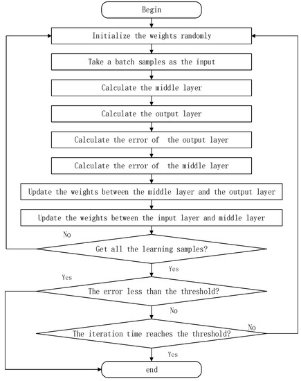 During training, the predicted value is calculated by transmitting it forward through the hidden layer. Then, by comparing the predicted value with the real value, the error is calculated and the weight of each element is modified by back propagation. When the error is less than the threshold, or the iteration time reaches the threshold, the training is stopped. The whole training process is shown in Figure 2.