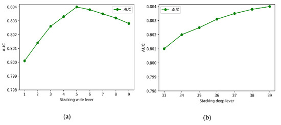 Our model proposed in this paper has two unique parameters, namely, stacking width and depth, which represent the number of detectors and the order of constructed features. Taking the Criteo dataset as an example, we explore the effect of stacking width and depth for MSSP. As shown in Figure 3, when the stacking width was 5 and the stacking depth was 39 (the number of fields in the dataset was also 39), the model reached the optimal result. For stacking deep lever, a higher-order feature results in better performance of the model, which proves that higher-order features can bring useful information to the model. For stacking wide lever, when the order was too high, the model became worse. The reason is that too many MVPs make the model too complex and lead to overfitting.