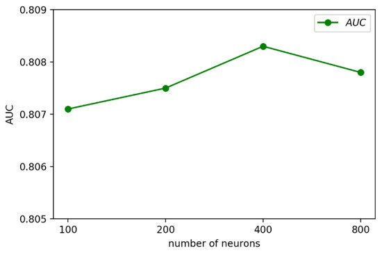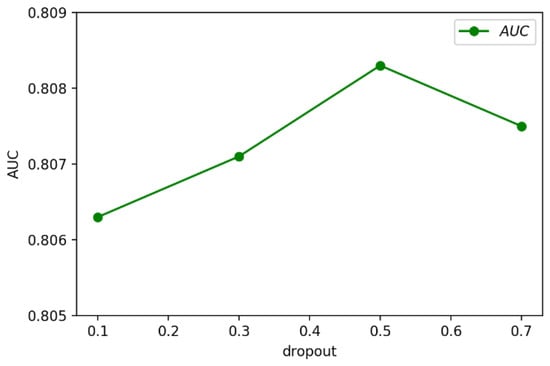 As shown in Figure 4, with the increase in dropout, the AUC of the model increased at first, and then declined when the dropout was greater than 0.5. This is mainly due to the inactivation of too many nodes, which affects the stability of the model. When the dropout was 0.5, only 50% of the neural network nodes were deactivated, and the hidden layer could still learn useful information on a whole. Meanwhile, the parameters and dependencies between nodes were greatly reduced, resulting in the highest AUC. With the further increase in dropout, more and more neurons were deactivated, leading to the disappearance of a large number of dependencies between nodes and a decline in learning ability; thus, the performance of the model worsened.