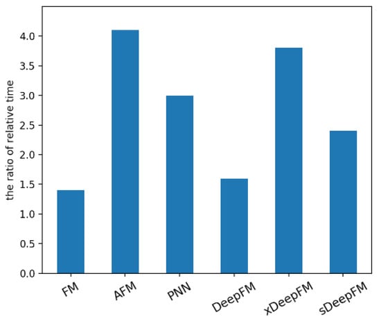 The training process of deep learning usually requires a lot of time and computing resources, which is an important reason for the development of deep learning. Since a real business scenario is oriented toward massive data, the training speed of the deep neural network is crucial for the implementation of algorithms. In this section, we compare the training efficiency of different models on the Criteo dataset by using the ratio of relative time calculated by the following formula: Tdl/Tlr, where Tdl and Tlr are the training time of the deep learning model and logistic regression model, respectively. The graphics card we used for training was Tesla P100. As shown in Figure 7, the abscissa represents the name of the models, while the ordinate shows the ratio of relative time. We can conclude that AFM required the longest training time, followed by xDeepFM and PNN, then our model, and finally DeepFM and FM. Gains of AUC performance and model complexity need to be achieved at the cost of time. Our model was slightly slower than the fastest FM within an acceptable range, but the enhancement of AUC was relatively large. Compared with AFM, xDeepFM, and PNN, the AUC and time performance were both improved.