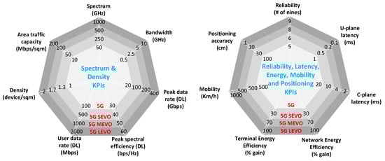 Table 2 summarizes our forecast of the B5G target KPIs evolution for the short (SEVO), medium (MEVO) and long (LEVO)-term evolution of 5G, compared to the KPIs targeted in today’s 5G New Radio (NR) [,]. This is also illustrated in a graphical representation in Figure 1, where the evolution of KPIs relating to spectrum and density is depicted in a first diagram on the left, and the evolution of the remaining KPIs including reliability, latency, energy efficiency, mobility and positioning accuracy depicted in a second diagram on the right. Below, we present the logic adopted in our forecast of the target values for each of the KPIs in Table 2. It is noteworthy that all of these KPIs are not new, but their target values are envisioned to evolve in the various phases of the evolution of 5G.