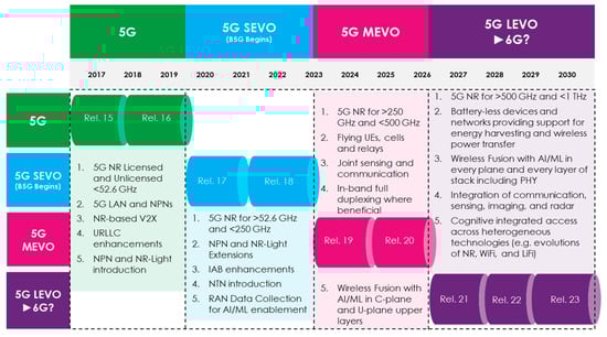The key technology trends for the short (SEVO) and medium (MEVO)-terms evolution of 5G are derived primarily from the studies around future wireless standards, noticeably 3GPP (Rel-17, Rel-18 and beyond), and IEEE 802 (evolution of 802.11 and 802.15) [,]. In both 3GPP and IEEE 802, we see a common trend to put priority on enhancing the various KPIs, such as coverage, throughput, latency, reliability, energy efficiency and positioning, to extend the support towards more emerging use cases, such as (i) V2X, (ii) KPI-demanding industrial IoT, (iii) private networks and (iv) aerial and satellite networks. Furthermore, we clearly see a trend to enhance the data collection and exposure from the network and devices to enable data-driven system optimization through artificial intelligence technologies.