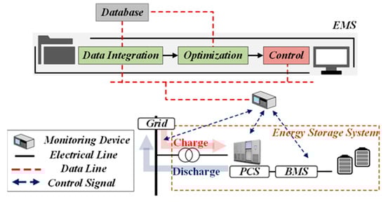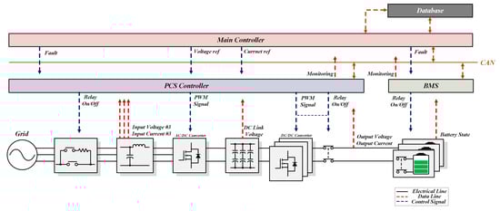 Figure 2 represents the proposed configuration of an ESS for high reliability and safety, which is typically used to discharge the ESS at peak daytime loads while charging the system at night to smooth it out. Losses in the ESS are caused by losses in the battery system and the PCS. The difference in power between the input and output is also caused by these losses, which then become part of the operating costs.