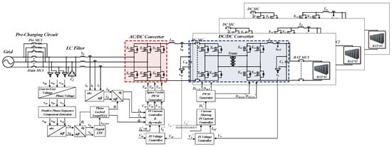 The algorithm proposed in this paper consists of an AC/DC converter, a DC/DC converter, and a battery system. The AC/DC converter is configured using a two-level converter that is easy to control, has a small number of switching elements, and has a low fault probability. Since the battery system requires insulation, and the ESS should have a large capacity, the DC/DC converter was configured using a full-bridge converter. Since the battery is charged by configuring the module, the DC/DC converter used current sharing to control charging.