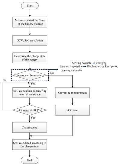 Figure 3 shows how SoC and SoH are calculated through BMS. The BMS senses the state of the battery (battery voltage, charge current, temperature, etc.) and calculates the SoC.