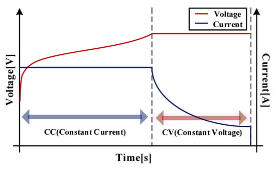 Normally, the battery is charged using the CC-CV method [10], as shown in Figure 5. Thus, the battery is charged to CC until the battery cell voltage increases to the cut-off area. Once the cut-off area is reached, a switch to the CV method is made to maintain the voltage. While charging the battery, the battery will deteriorate and the CC time will be reduced, as Figure 6 shows.