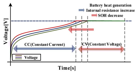 An equation for calculating the SoH according to the charging time, such as that found in [7], is a commonly used method, but since the change of the charging time can be large depending on the internal resistance, an equation considering the internal resistance is required [7,8,9]. The voltage, or flowing current applied to the battery, determines its charging speed, safety, reliability, and lifetime.