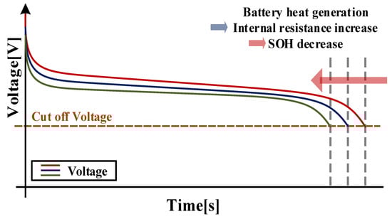 Decrease in charging time is caused by chemical reactions in the battery, and the amount of current also decreases due to the decrease in capacity during charging. The deterioration of the battery causes an increase in internal resistance, which reduces the time to reach the cut-off voltage even when charged with the same current. Because the discharge is discharged up to the cut-off voltage, the SoH is judged by comparison with the initial state and the capacity of the battery. As shown in Figure 7, the discharge time is also reduced due to the increase in internal resistance caused by deterioration.