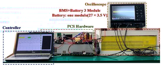 The overall hardware configuration consisted of the PCS (AC/DC converter + DC/DC converter) and controller, and the output side consisted of three modules of lithium-ion battery (one module: 27 × 3.5 V). In addition, for the oscilloscope, a notebook, and WT3000 were used for operation.