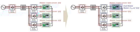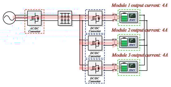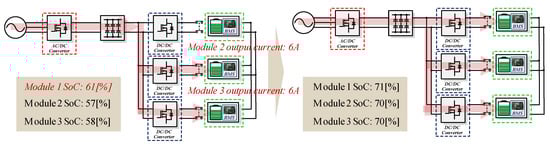 Modules 2 and 3, whose SoC states are less than 60%, are turned on to charge the battery, and Module 1 with an SoC state greater than 60% is turned off. If the average SoC of the ON module and OFF module are the same, it shows the current waveform.