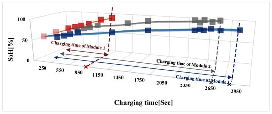 After obtaining the charging time data for SoH prediction, the relation is terminated, the charging time of the battery module to obtain the SoH is obtained, and the charging time is derived from the implemented relation. The SoH calculation using the charging time is calculated by Equations (3) and (4), and the SoH can be calculated using Equation (5) comparing before and after charging.