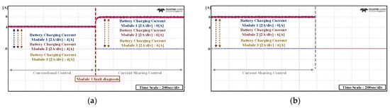 The battery charge current waveform when fault module occurs. (a) Sharing of fault module current sharing, (b) current waveform at end of charge.