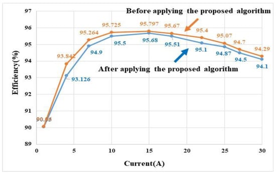 Figure 21 features a graph comparing before and after the application of the proposed algorithm. The maximum efficiency after applying the proposed algorithm was 95.68%, while the efficiency prior to application was 95.797%. Thus, the difference in efficiency was calculated to be 0.117%.