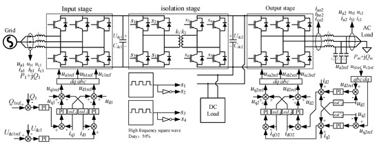 The AC-DC hybrid microgrid including three-stage AC-DC-AC power electronic transformers with AC and DC interfaces improves the connection between the microgrid and the utility grid and various AC and DC sources and loads. The power electronic transformer consists of three parts: the input stage, isolation stage, and output stage. The input stage connected to the utility grid is a rectifying part, which rectifies the input alternating current at 50 Hz into direct current; the isolation stage consists of a pulse modulation, high frequency transformer, and pulse demodulation [9], which converts the DC inverter of the input stage output into a high frequency square wave and then couples it to the secondary side through a transformer and then rectifies to a direct current to supply power to the DC load; the output stage is the inverter part, which inverts the DC output of the isolation stage into a three-phase 50 Hz AC power supply for the load. Its structure and control system are shown in Figure 2.