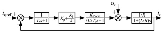 Due to the symmetry of the two current inner loops, iq is taken as the object of discussion. The delay of the current inner loop signal sampling and the small inertia characteristics of the Pulse Width Modulation (PWM) control are considered. The structure of the decoupled iq current inner loop is shown in Figure 4.