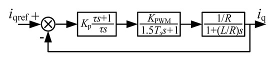 Ts is the sampling period of the current inner loop (which is also the PWM switching period), and KPWM is the equivalent gain of the bridge PWM. To simplify the analysis, the perturbation of uq is not considered, and the PI regulator transfer function is written as a pole-zero form, as shown in Equation (1).