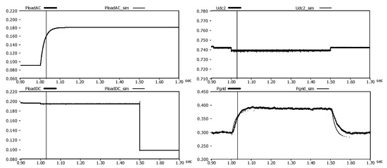 As shown in Figure 7, the dynamic curve of the simplified model proposed in this paper was basically consistent with that of the detailed model. The AC load power PloadAC_sim curve of the simplified model and the AC load power PloadAC curve of the detailed model were almost identical, both of which increased due to the input of the AC load. The DC voltage Udc2 of the detailed model fluctuated slightly due to the switching of the load, and the DC voltage Udc2_sim of the simplified model was always constant because the reference signal remained constant. At T = 1 s, when the AC load was input, the DC load power PloadDC of the detailed model also had a small fluctuation due to the small fluctuation of the DC voltage Udc2. Since the DC voltage Udc2_sim of the simplified model remained stable, the DC load power PloadDC_sim of the simplified model also remained stable. At T = 1.5 s, due to the cut off of the DC load, the DC load power of both the detailed model and the simplified model decreased. At T = 1 s, due to the input of AC load, the grid power increased. At T = 1.5 s, the DC load was cut off, and the grid power decreased.
