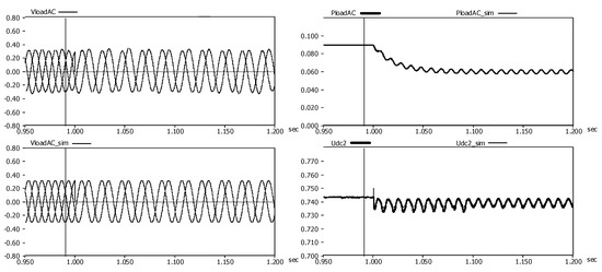 As shown in Figure 8, at 1 s, the a-phase voltage dropped to 0 due to the a-phase failure, and the b and c-phase voltages remained stable. The AC load voltage VloadAC_sim curve of the simplified model was able to maintain good consistency with that (VloadAC) of the detailed model.