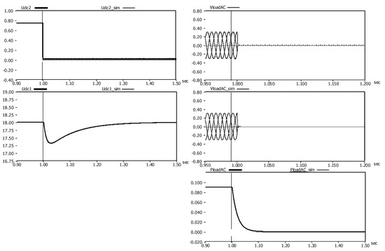 As shown in Figure 9, when a two-pole short-circuit fault occurred on the DC load side at 1 s, the DC load voltage Udc2 suddenly dropped, which also caused the fluctuation of the input-stage side DC voltage Ud1. The DC load voltage Udc2 waveform of the simplified model and that (Udc2_sim) of the detailed model almost overlapped. Although the waveform of Ud1 in the detailed model fluctuated, its steady-state value was consistent with that (Ud1_sim) of the simplified model. The AC load voltage VloadAC_sim curve of the simplified model maintained good consistency with that (VloadAC) of the detailed model. As shown in Figure 10, the three-phase AC voltage VloadAC of the output stage dropped to zero due to an equivalent three-phase short circuit, and the AC load power PloadAC also dropped to zero. This shows that the dynamic characteristics of the simplified model maintain good consistency with that of the detailed model.