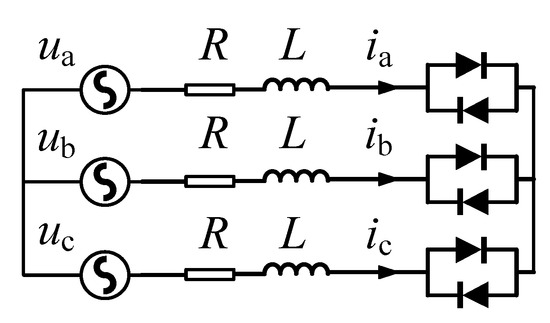 When a two-stage short circuit fault occurs on the DC side due to the DC voltage dropping to zero and the freewheeling effect of the short-circuit reactance, it is equivalent to a three-phase short circuit occurring on the AC side [10]. Its equivalent circuit is shown in Figure 10.