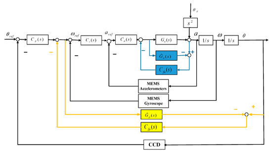 The perturbation torque applied to the tilting mirror on the optoelectronic stable control platform is mainly concentrated in the low-frequency and intermediate-frequency parts of 1–20 Hz [20]. To solve the problem of poor low-frequency disturbance rejection capability of the system, this paper proposed the structure of the dual disturbance observers using the acceleration loop and the position loop. The diagram of the control structure of the dual disturbance observers is shown in Figure 3. MEMS accelerometers, MEMS gyroscope, and CCD are acceleration, velocity, and position loop sensors, respectively. Their gains are determined by the scale factors of each sensor, but they were normalized in the article and are equivalent to the gain of the controller.